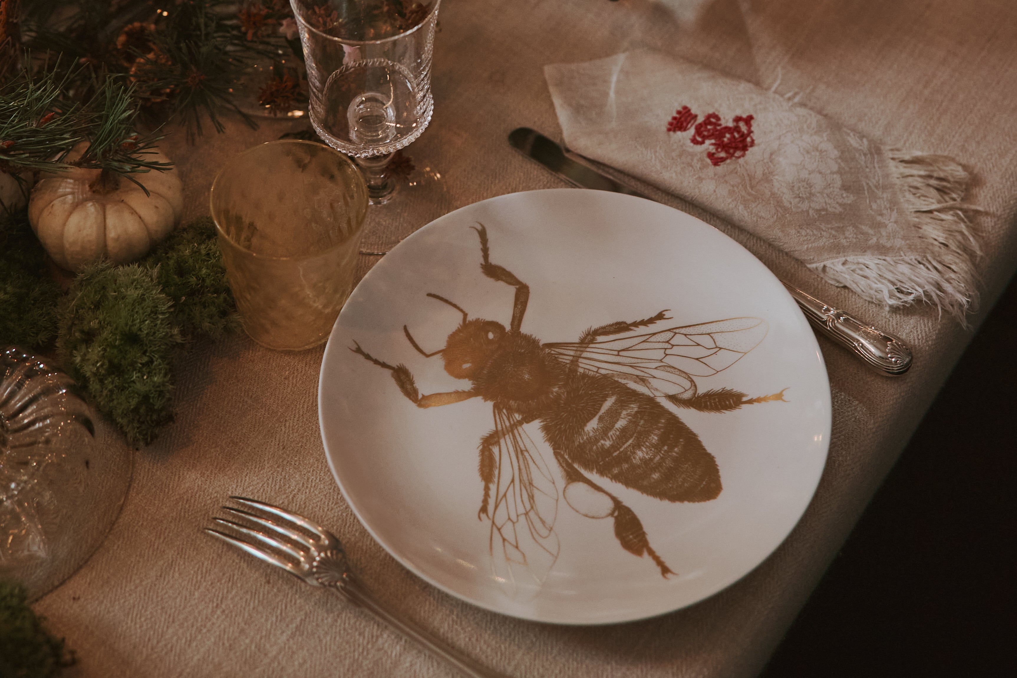 Everything starts with a statement piece. At the centre of the table, the Rosace scented candle — our holiday limited-edition — sets the tone with a décor adorned in 24-carat gold, crafted like an antique stained-glass window. Its woody fragrance, blending fir, wood fire and vetiver, creates a festive and comforting atmosphere.